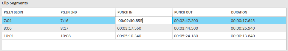 - To change the start time, click in the Punch In cell and manually type the start time for the current segment.