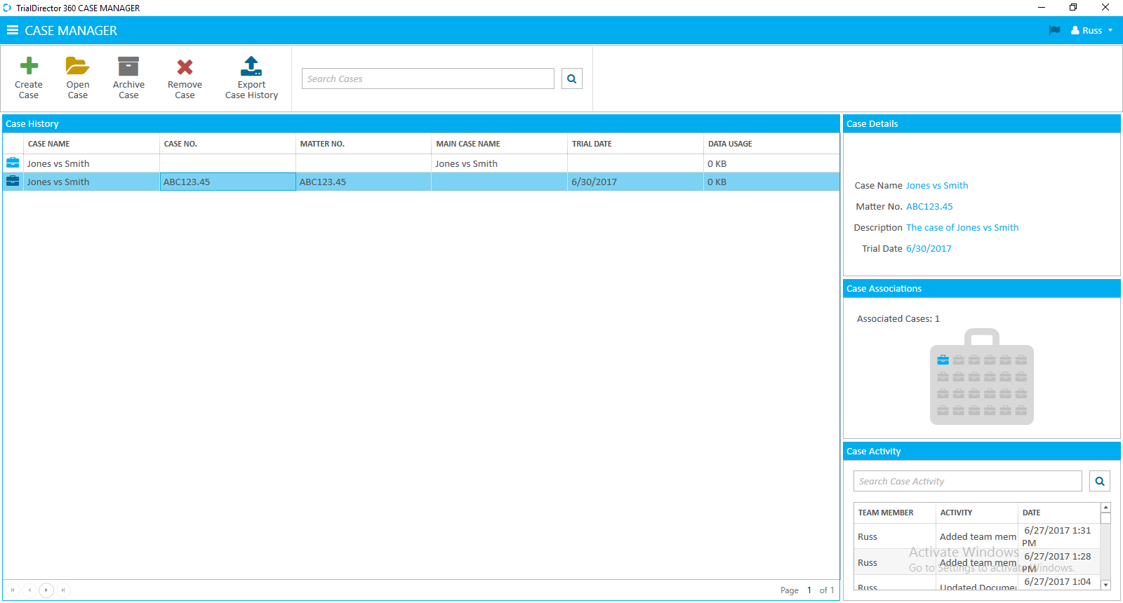 Case History contains a record for all of the cases created in your TrialDirector 360 CASE MANAGER account. To open Case History, click the Case History button on the CASE MANAGER Start Page.