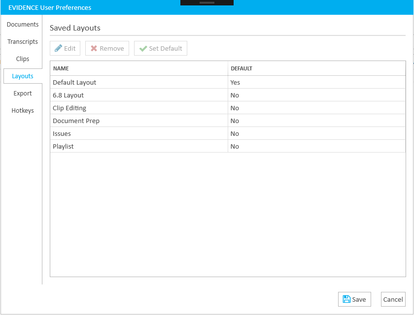 From this tab, you can change the name of a layout, remove a layout, or set a layout as default.