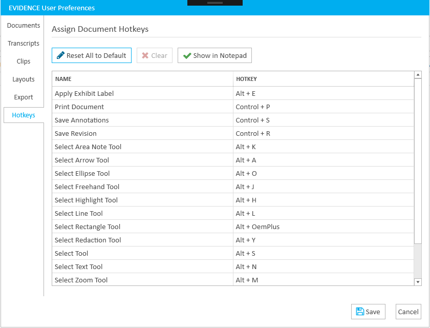 There are hotkeys that can be used when working with documents in EVIDENCE. You can easily change the hotkey combinations or reset hotkey combinations. You can also show the hotkey assignments in Notepad.